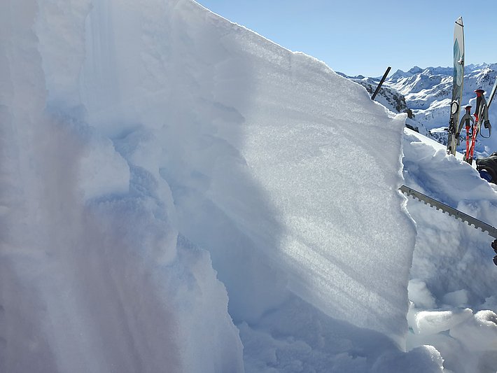 Präzisionsarbeit erfordert diese dünne Wand, in der im Sonnenlicht die unterschiedlichen Schneeschichten sichtbar werden. (Foto: Jochen Bettzieche / SLF)