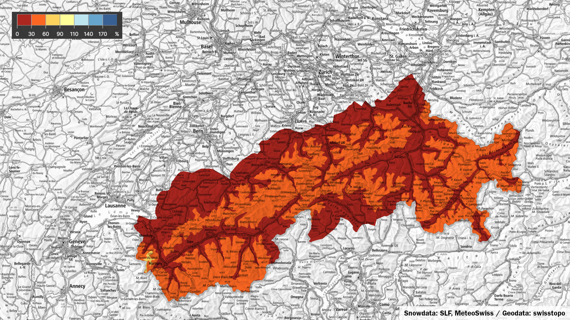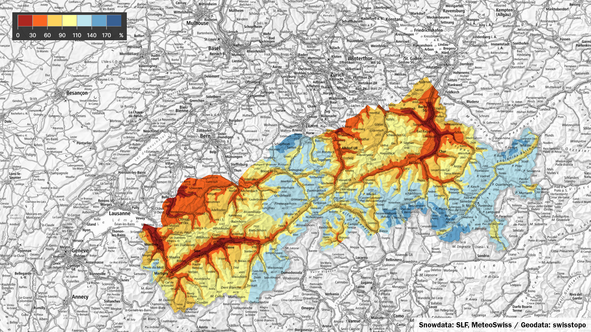 Selbst in einem warmen Wintern kann es während einiger Tage bis ins Flachland Schnee geben, und das flächendeckend und nicht nur vereinzelt. Dazu braucht es lediglich ein zufälliges Zusammenspiel von kalter Luft und Niederschlag, und das hatten wir während des angesprochenen Monatswechsels und im Januar. Wenn wir nur die Anzahl Schneetage im Mittelland betrachten, ist dieser Winter gar nicht so schlecht. Die ersten Schneemassen überraschten ja sogar die Skigebiete. Die waren noch gar nicht bereit, den Betrieb aufzunehmen. Das änderte sich dann aber ziemlich rasch.