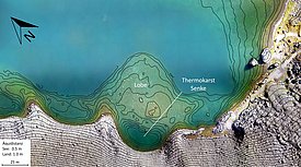 Da es allerdings aus thermischen Gründen unter einem Gebirgssee keinen Permafrost geben kann, bedeutet dies, dass der See jünger ist als die blockige Lobe auf seinem Grund. Dies wiederum erklärt die tiefe Senke (Abb. 1 und 2) innerhalb der Lobe nahe des Ufers. Als der Seespiegel stieg, schmolz das Eis in der Lobe, die Oberfläche sackte zusammen und bildete eine sogenannte Thermokarst-Senke.