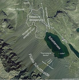 Am Nordwestufer des Schottensees in Richtung Davos gibt es einen Bereich mit sehr grobblockigem Schutt (Abb. 1). Dies ist das Ablagerungsgebiet eines Felssturzes, welcher höchstwahrscheinlich den See aufstaute. Ein weiteres Indiz dafür findet sich am unteren Ende dieser Ablagerung. Hier tritt eine Quelle hervor und in der Umgebung finden sich dünenartige Wellen im Boden, sogenannte Mega-Rippel (Abb. 3).
