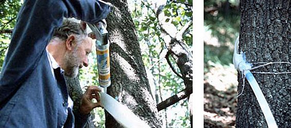 Alle zwei Jahre werden Blätter und Nadeln direkt von je 5 Bäumen der Hauptbaumarten aller LWF-Flächen geerntet (Abb. 6). Die Blätter/Nadeln werden sofort bei 65 °C getrocknet und anschliessend wird das Gewicht von 100 Blätter oder 1000 Nadeln bestimmt. Das Gewicht und besondere Merkmale der Frischblätter, -nadeln werden protokolliert. Die Proben werden dann wie die Streufallproben gemahlen und chemisch analysiert.