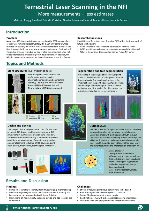 Kooperation FinanzierungWaldinventuren sind auf präzise und reproduzierbare Messungen angewiesen. Daher bilden Feldaufnahmen nach wie vor die wichtigste Quelle an Daten für Waldinventuren. Die rasche Entwicklung von tragbaren terrestrischen LiDAR Systemen in den letzten Jahren führt zu der Frage, ob diese Technologie für Waldinventuren verwendet werden kann, insbesondere wo direkte Messungen sehr teuer oder unmöglich sind. Es gibt jedoch immer noch offene Fragen, was deren Genauigkeit und Reproduzierbarkeit betrifft.