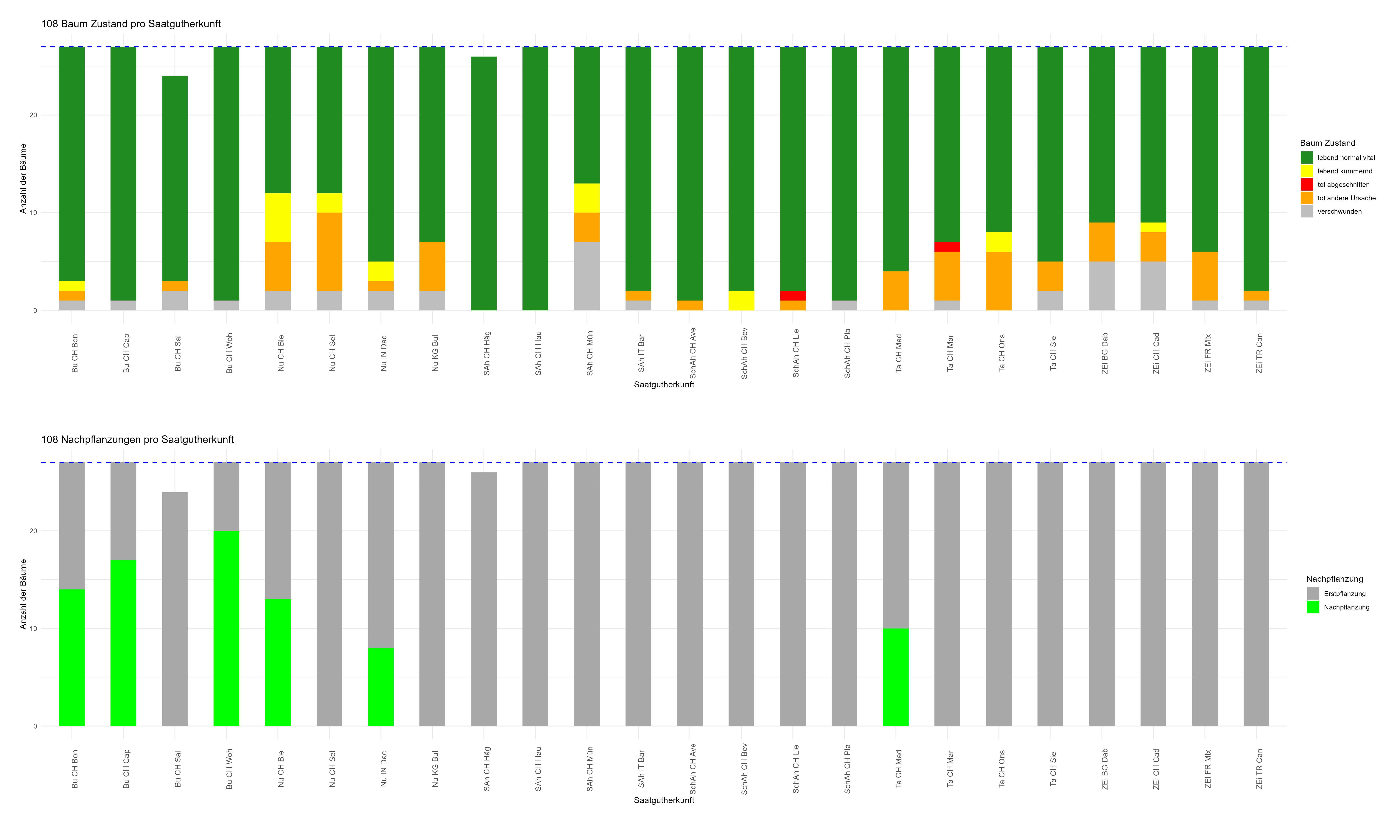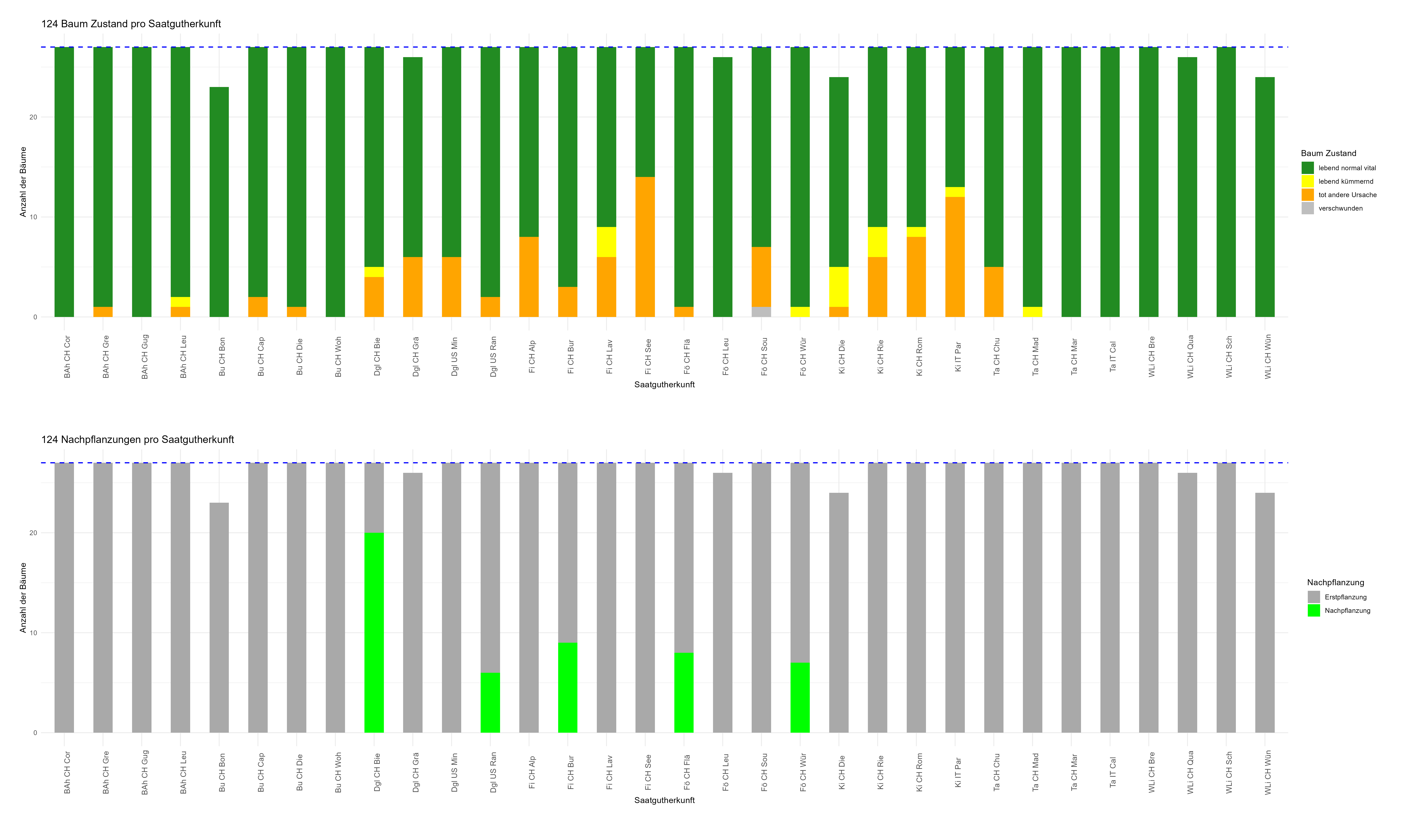Anzahl BA = Anzahl der in einer Testpflanzung getesteten Baumarten, PP = Pflanzperiode, in welcher eine Testpflanzung eingerichtet wurde: 1 bedeutet Herbst 20 - Frühjahr 21, 2 bedeutet Herbst 21 - Frühjahr 22, 3 bedeutet Herbst 22 - Frühjahr 23. Zustand: pro Inventurzeitpunkt (Jahreszahl) Link zu 2 Figuren: Fig 1 Beurteilung des Zustands aller Pflanzen pro Saatgutherkunft pro Fläche (3 Wiederholungsblöcke x 9 Pflanzen= 27 Pflanzen pro Saatgutherkunft pro Fläche) Kategorien: lebend normal vital, lebend kümmernd, tot, abgeschnitten und verschwunden; Fig 2 Anzahl Pflanzen welche zum Inventurzeitpunkt bereits nachgepflanzt waren. Die Bezeichnung der Saatgutherkunft setzt sich auch dem Baumartenkürzel dem Herkunftsland und den ersten 3 Buchstaben der Herkunftsgemeinde zusammen. Baumartenkürzel: BAh Bergahorn, BHa Baumhasel, Bu Buche, Dgl Douglasie, EBe Elsbeere, Fi Fichte, Fö Föhre, Ki Kirsche, Lä Lärche, Nu Nussbaum, SAh Spitzahorn, SchAh Schneeballblättriger Ahorn, SEi Stieleiche, Ta Tanne, TEi Traubeneiche, WLi Winterlinde, Ze Zeder, ZEi Zerreiche