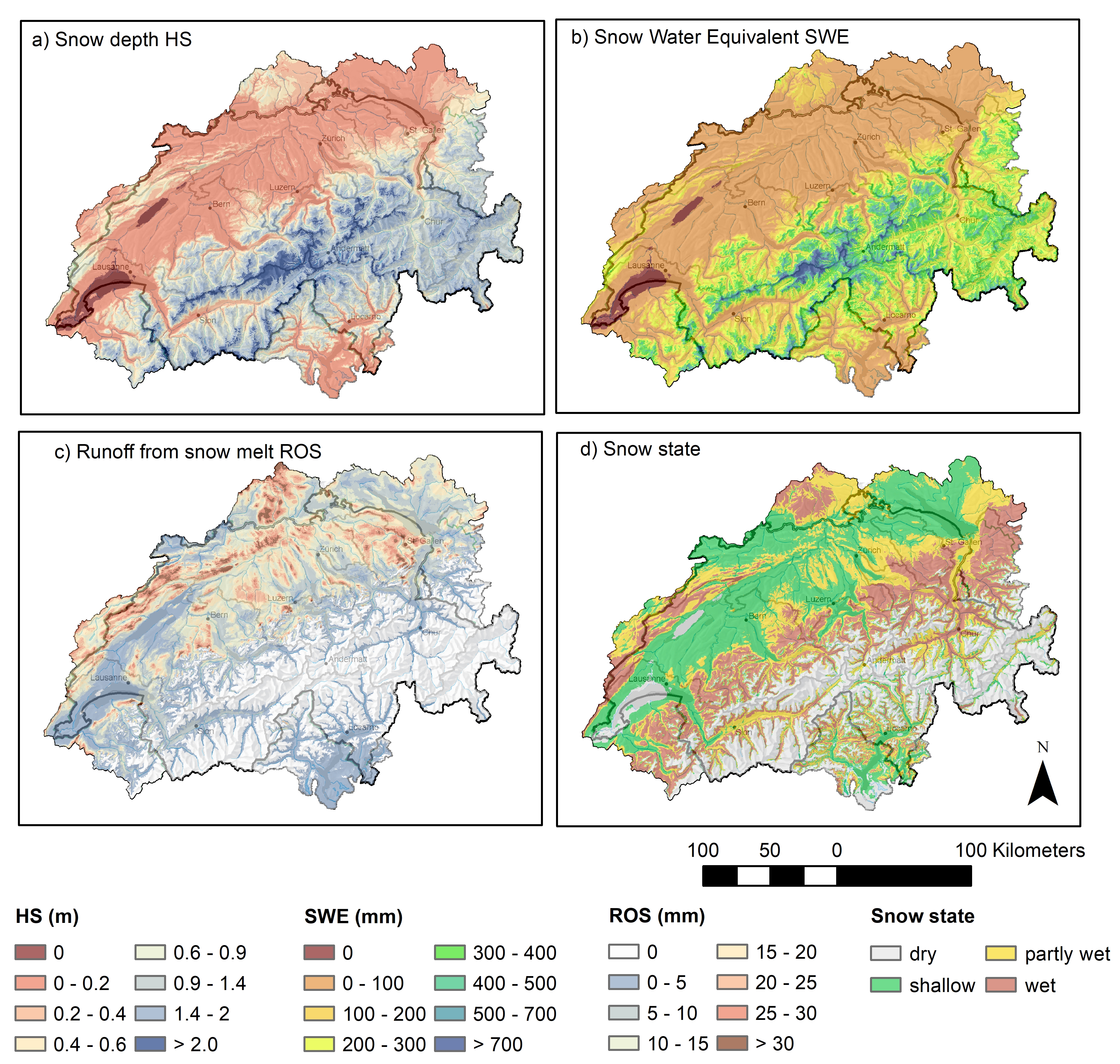 Der OSHD erstellt von November bis Juni täglich schneehydrologische Analysen, die wichtige Informationen über die Schneesituation der Schweiz enthalten. Durch den Einsatz einer physikalisch basierten Modellkette prognostiziert das OSHD die Schneeschmelze und andere entscheidende Variablen im Zusammenhang mit der saisonalen Schneedynamik. Karten in Abbildung 1 zeigen beispielhaft Schneehöhen (A), Schneewasseräquivalente (B), den Schmelzwasserabfluss (C) und den Zustand der Schneedecke (D) als zentrale Ergebnisse des Modells. Derartige Informationen sind äusserst wertvoll für die Vorhersage von Überschwemmungen, insbesondere bei starken Regen-auf-Schnee-Ereignissen.