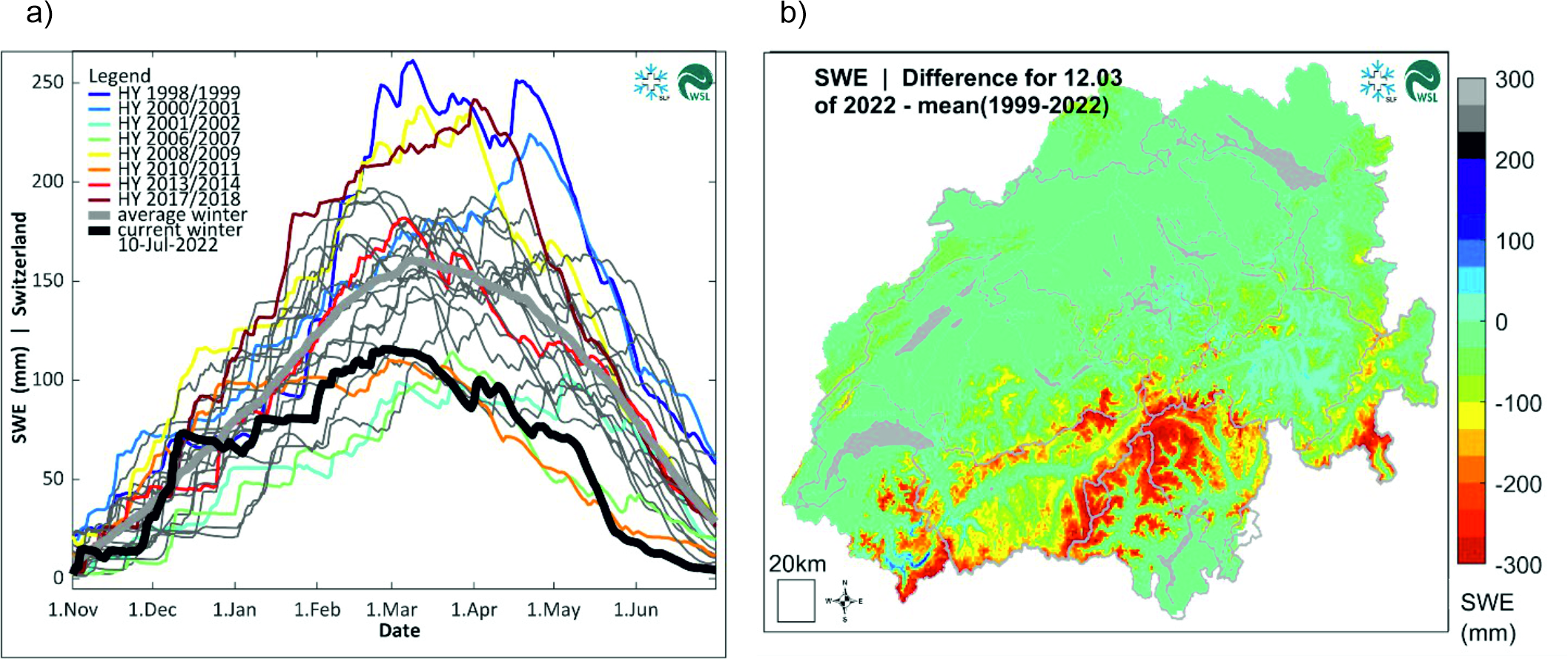 Das SLF betreibt einen operationellen schneehydrologischen Dienst (OSHD), der laufend die räumliche und zeitliche Verteilung der Schneewasserressourcen in der Schweiz analysiert und damit verbesserte hydrologische Vorhersagen und vorausschauende Gewässerregulierung ermöglicht.
