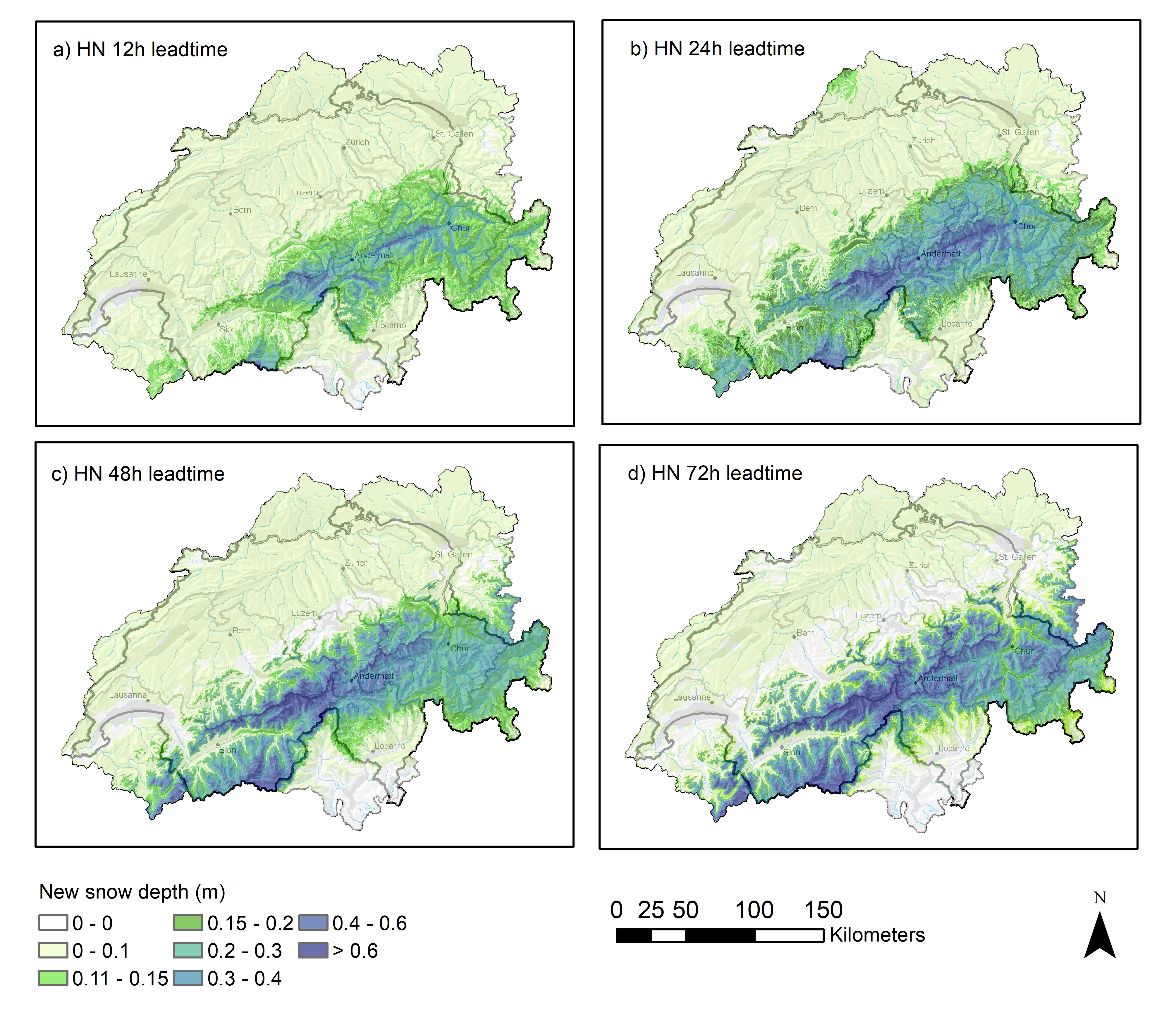 Der OSHD erstellt auch Neuschnee Vorhersagen mit unterschiedlichen Vorhersagezeiträume (Abbildung 3). Zusammen mit Karten zur Gesamtschneehöhe (Abbildung 1A) bilden diese Produkte eine wichtige Grundlage für den Lawinenwarndienst, der vom SLF betrieben wird, um die aktuelle Lawinengefahr zu bewerten. Sowohl die Karten zur Gesamtschneehöhe als auch zur Neueschneehöhe werden auf White Risk und MeteoSchweiz veröffentlicht.