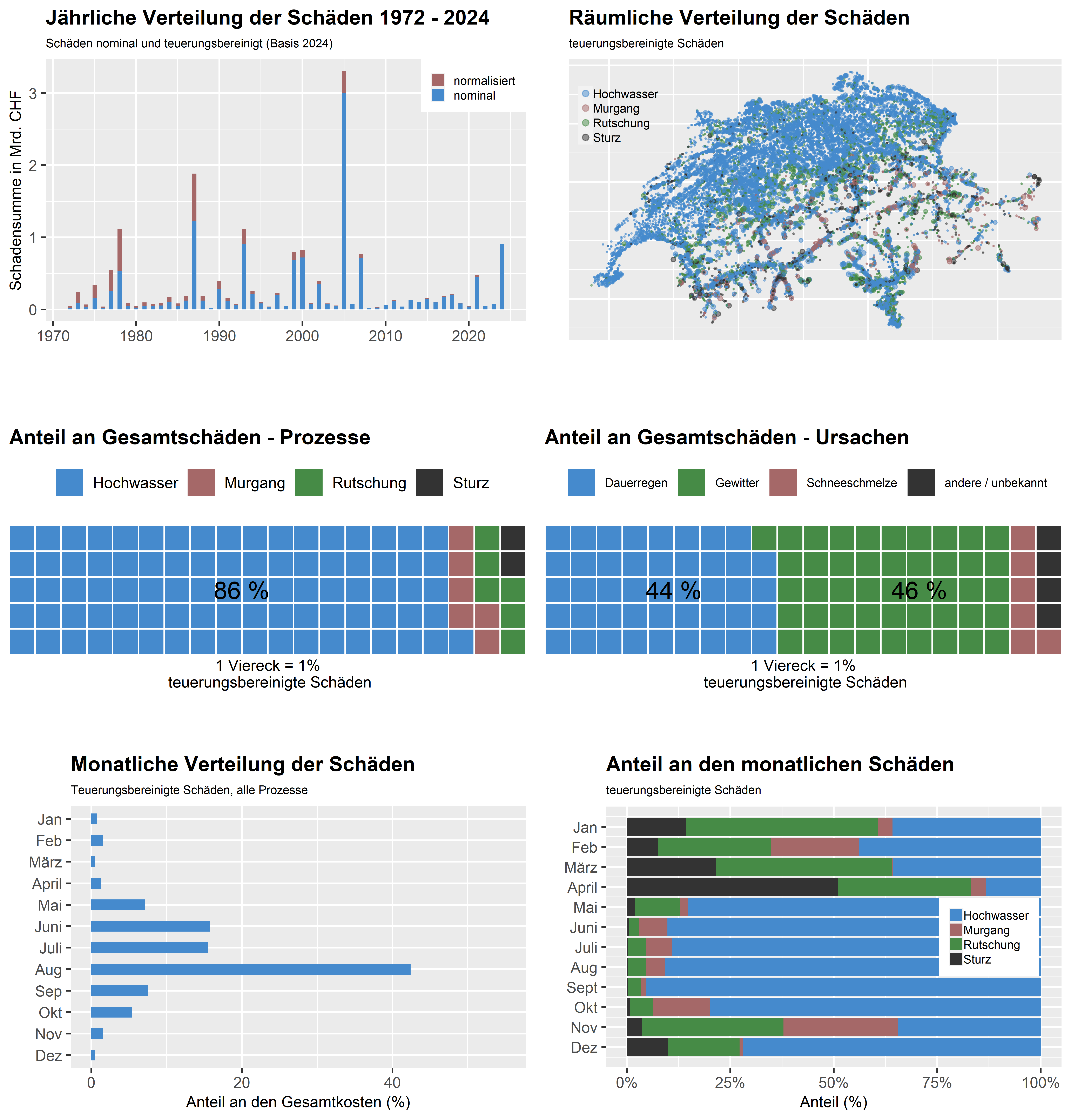 Die gesamte teuerungsbereinigte Schadenssumme seit 1972 beläuft sich auf über 17 Milliarden Franken. Die untenstehende Abbildung zeigt deutlich, dass wenige grosse Ereignisse den Löwenanteil dieser Summe verursachten. Darunter war das Unwetter vom 21./22. August 2005 mit einer Gesamtschadenssumme von etwa drei Milliarden Franken das schadenreichste Hochwasser in der Schweiz, das in der Datenbank verzeichnet ist.