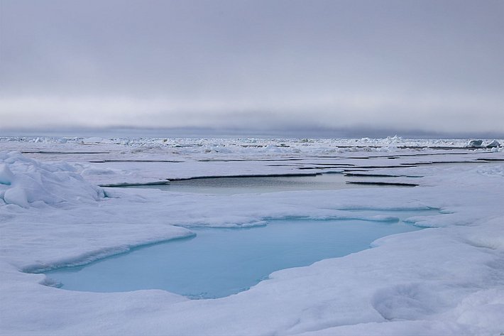Nachdem wir die Arbeit auf dem Eis wieder aufgenommen hatten, wurde klar, dass es auf allen Ebenen zu Veränderungen gekommen war. Zunächst beobachteten wir rundliche Körner (Abbildung 2) statt des winterlichen Tiefenreifs, da die Temperatur im Schnee konstant bei etwa 0 °C lag. Die Eisscholle war extrem nass, flach, hatte überflutete Bereiche und war mit matschigem Schnee mit hohem Flüssigwassergehalt bedeckt. Schmelztümpel entstanden und erstreckten sich über extrem weite Gebiete.