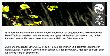 Der WSL-Newsletter informiert ungefähr zweimonatlich über Forschung, Publikationen und weitere Neuigkeiten von WSL und SLF.