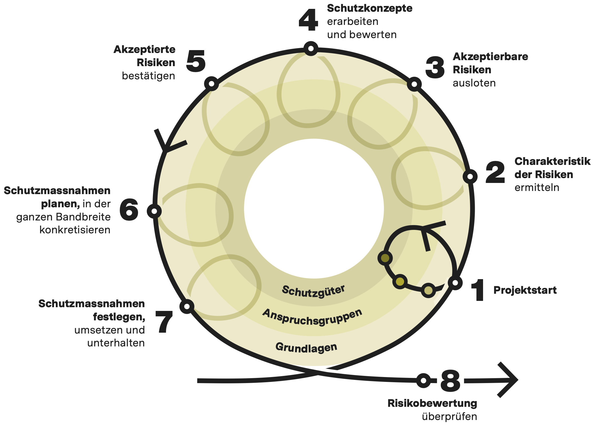 Lösungen lassen sich in diesem Spannungsfeld nur finden, wenn die verschiedenen Betroffenen und Beteiligten von Anfang an ein gemeinsames Bild der Risiken entwickeln: Welches sind die wesentlichen Risiken? Welche Risiken akzeptieren wir? Was ist uns wichtig? Wo setzen wir an, um die nicht akzeptierten Risiken zu reduzieren und für möglichst guten Schutz zu sorgen? Wer kann (und sollte) welchen Beitrag dazu leisten?
