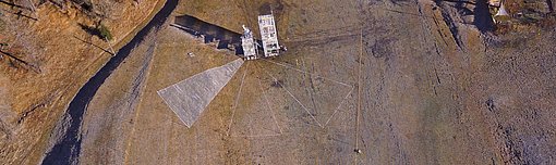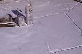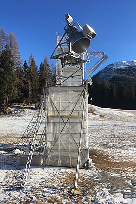 Auf dem 50 x 50 m grossen Versuchsfeld stehen je ein zehn und ein sechs Meter hoher Gerüstturm. An jedem Turm befindet sich ein Messgerät. Das eine Gerät, ein Scatterometer, sendet Mikrowellen-Signale aus und rechnet aus dem reflektierten Signal auf die Schneeeigenschaften zurück. Das andere Gerät, ein Radiometer, empfängt die vom Schnee natürlich abgestrahlten Mikrowellen (Abb. 2). Aus den Daten des Scatterometers lässt sich unter anderem ein dreidimensionales Bild der Schneedecke erstellen.