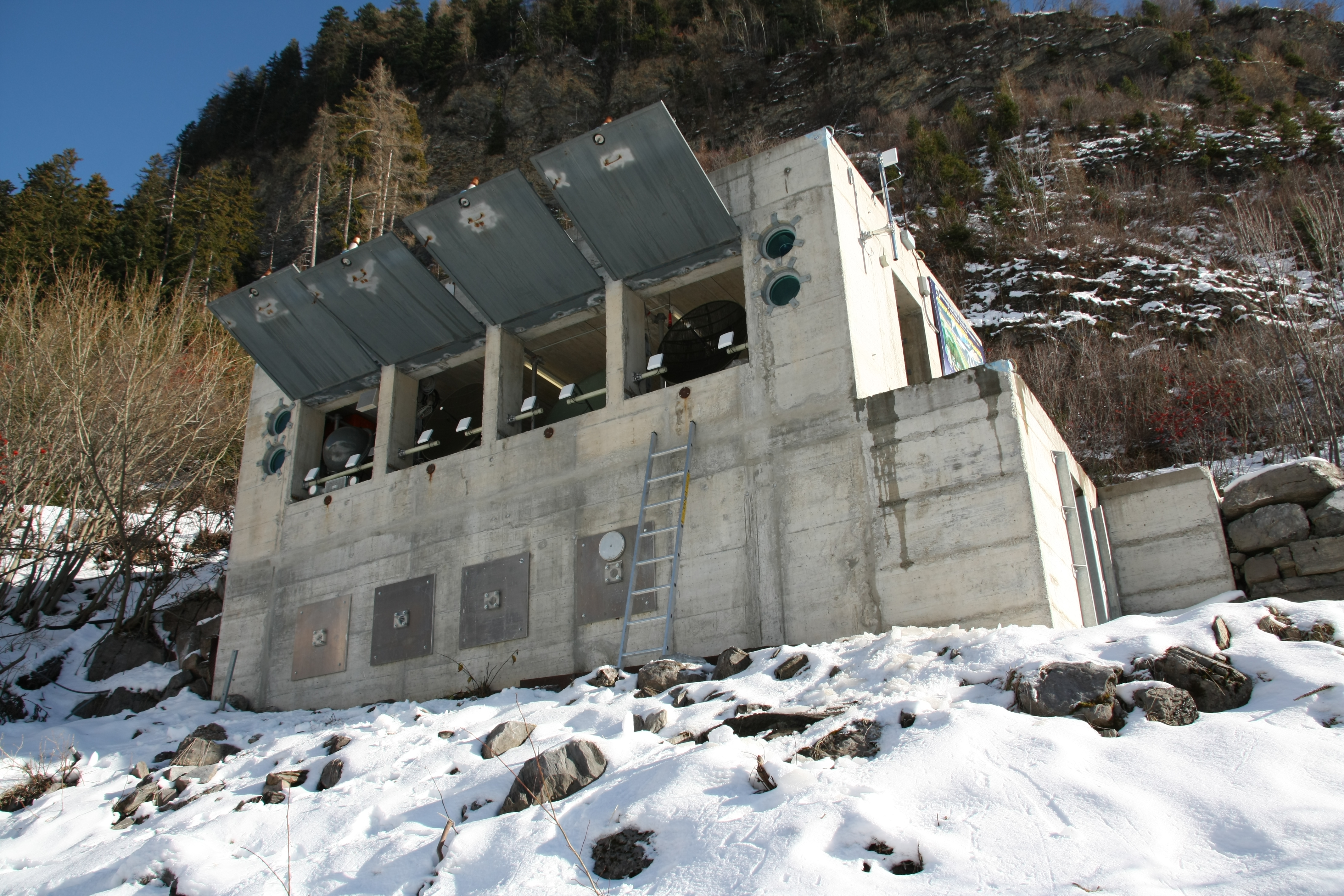 Der Betonbunker hat zwei Stockwerke. Oben sind Doppler Radars und Videokameras montiert, die die Frontgeschwindigkeit der Lawinen messen. Die Radars sind in geöffneten Fenstern platziert und erfassen von dort aus die ganze Lawinenbahn. Jedes Fenster wird mit einer Klappe vom SLF-Team kurz vor Eintreffen der Lawine geschlossen. Im unteren Stock sitzen die SLF-Wissenschaftler während des Experiments und überwachen die Datenerfassungseinrichtungen.