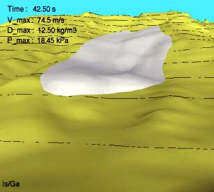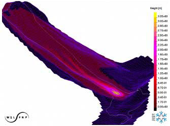 Ziel der Experimente im Vallée de la Sionne ist es, die Kenntnisse über die phyiskalischen Prozesse in einer Lawine zu erweitern und die vorhandenen Lawinenberechnungsmodelle zu verbessern. Dank den zahlreichen Messdaten ist es nun möglich, die Qualität der numerischen Simulationsmodellen genauer zu beurteilen und deren Schwächen aufzudecken. Die Messergebnisse liefern auch die notwendigen Grundlagen zur Entwicklung von neuen Modellansätzen. In Abbildung 1 ist eine Momentaufnahme einer Nachsimulation der Lawine vom 25. Februar 1999 zu sehen. Die weisse Linie stellt dabei die beobachtete Auslaufdistanz der Lawine dar. Bei diesem Modellansatz handelt es sich um ein zweidimensionales Fliesslawinenmodell, das auf dem Stoffgesetz von Voellmy beruht.