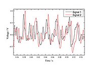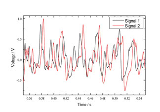 Signale der Optischen Korrelationssensoren aufgenommen bei einem Laborversuch auf einer Rutschbahn (Ausschnitt). Man erkannt deutlich, dass das Signal 2 leicht zeitlich gegenüber dem Signal 1 verschoben ist. Natürlich sind die beiden Signale nicht identisch, aber die Ähnlichkeit ist unverkennbar.
