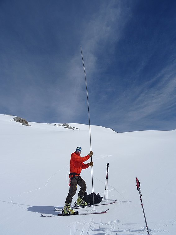 So we stow our ski equipment and other material on board the helicopter and fly over towering rainforests to the glacier's accumulation area, around 2,000 m above sea level. Together with a female colleague, with the help of a GPS, my job is to cover more than 80 points systematically spread across the entire glacier, measuring the snow depth at each one. But the kind of avalanche probe we use for this purpose in Davos definitely wouldn't be much use, being way too short! On average, the snow here on the glacier is more than 4.5 m deep, so we have to use extendable steel pipes that can be screwed together. And they aren't exactly light! The maximum snow depth we recorded was 7.5 m. At 8 p.m., after an intense day's work, we dragged ourselves back to camp and the 'comfort' of our tents. Only then were we told that hardly anyone had managed to measure all the points in a single day before. So that was something to be proud of. That said, I feel obliged to point out that far more extensive data could have been gathered more efficiently using a drone.