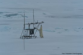 But luckily for us (through not so luckily for our colleague), an automatic weather station soon aroused the bear's curiosity and he wandered off to play with the funny-looking wind-measuring devices. Eventually, after thoroughly inspecting every single instrument on our ice floe, he got bored and moved on. We were then able to bring our sledge (fortunately intact) back onto the ship.