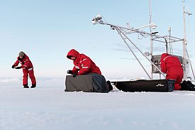 ...Fast forward to 20 August: Following a short detour to the North Pole, we wake up one morning to find ourselves on a new floe. But lo and behold: there's no snow to be seen! There is some white stuff that looks like snow and feels like snow, but in fact this is what's known as the "litter layer", consisting of melted sea ice from which the brine has already leached away. Not letting this put us off, we are keen to get down to the snow measurements right away.