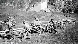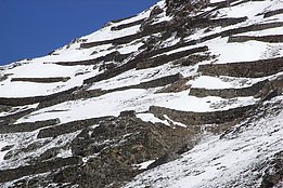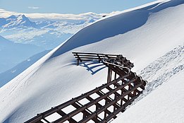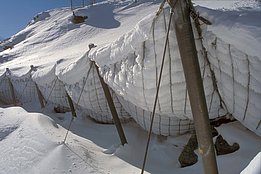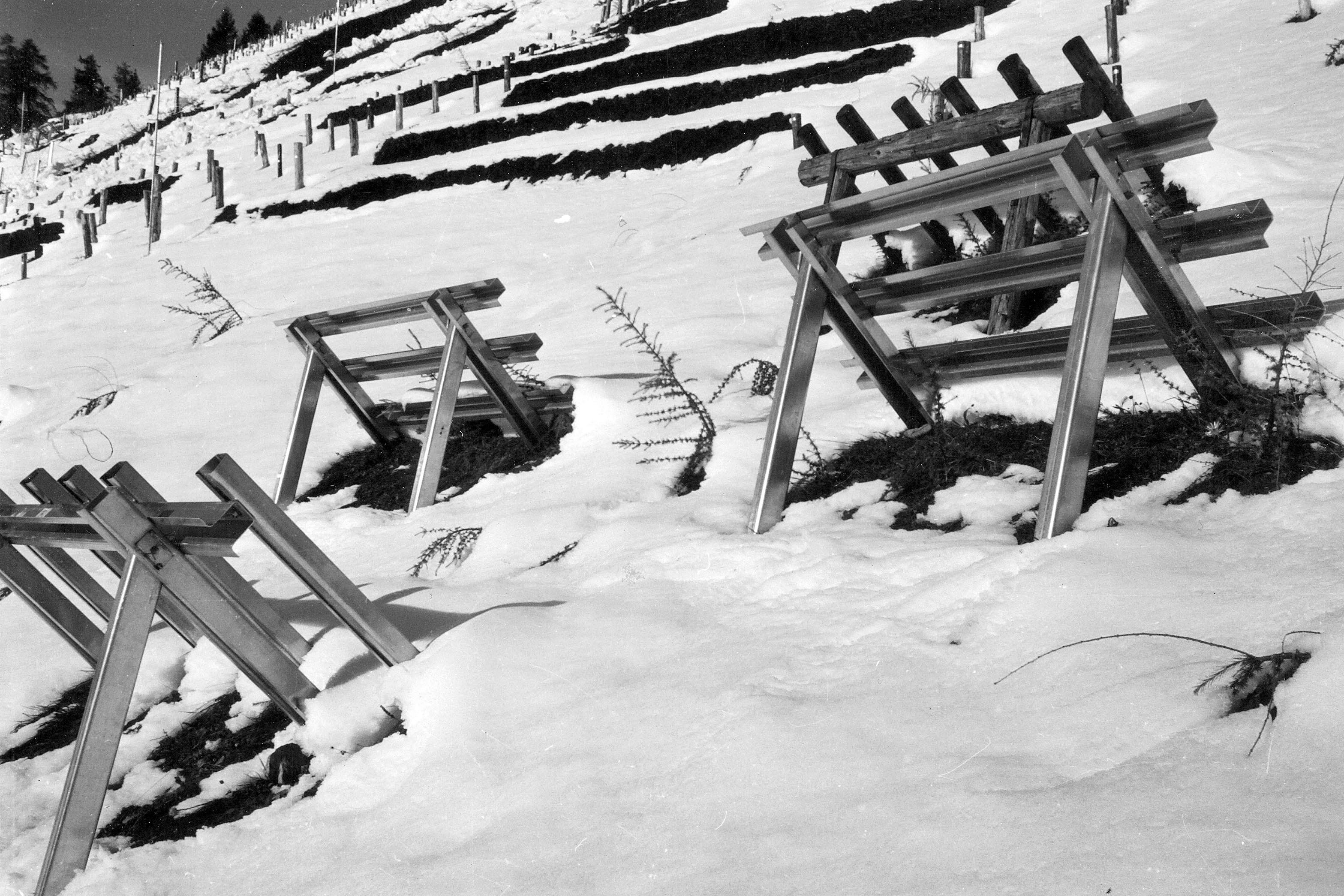 A series of major disasters in the winter of 1950/51 prompted a major realignment of avalanche protection activities. Within a short time, walls and terraces were replaced by lean and much more effective structures made of steel, aluminium, wood, wire rope or concrete. In addition, an increase in central government funding triggered a deluge of structural defence projects. In the intervening period, more than 500 km of defensive structures have been installed. In the context of physical avalanche protection in Switzerland, defensive structures play the most significant role. The SLF has been assisting both practitioners and the relevant industrial actors with advice and guidelines ever since the early days. It published initial guidelines on retaining structures in 1955. The current version of the guidelines on defence structures in avalanche starting zones, published in 2007, is based on developments that have taken place over a period of more than 50 years. Steel snow bridges (Fig. 6) and snow nets (Fig. 7) have now emerged as the principal defences. The SLF inspects new types of defensive structures in collaboration with the Federal Office for the Environment (FOEN).