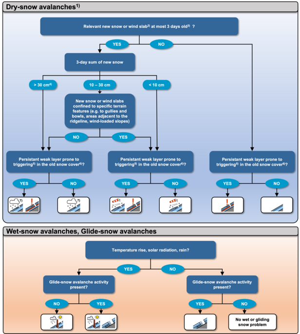 The currently predominant avalanche problems are determined using the decision-making tool illustrated below.