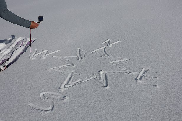 In Zweierteams zeichnen wir die Kompassrose in den Schnee und überprüfen sie anschliessend mit dem Kompass.