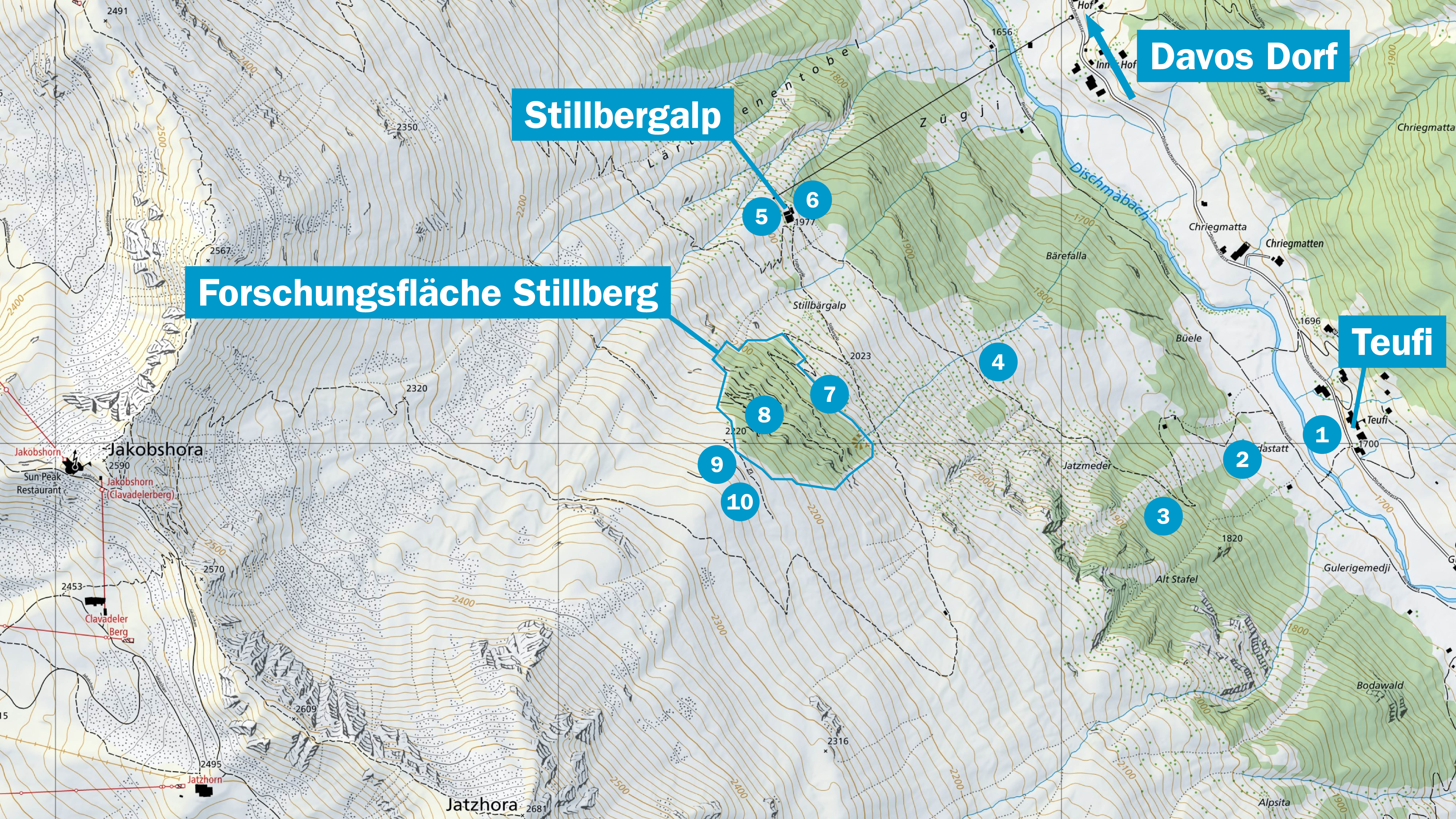 Bitte reisen Sie mit den öffentlichen Verkehrsmitteln an. Entweder mit dem Bus bis zur Haltestelle Davos Dischma, Teufi oder mit der Jakobshornbahn mit anschliessender Wanderung (Bergwanderweg) zur Forschungsfläche. Diese erreichen Sie von Teufi aus in etwa eineinhalb Stunden über die Stillbergalp (ca. 500 Höhenmeter bergauf) oder vom Jakobshorn aus in etwa einer Stunde (ca. 400 Höhenmeter bergab). Einzelne Posten befinden sich bereits auf dem Weg zwischen Teufi und Stillbergalp, weitere etwas oberhalb direkt in der Forschungsfläche. Der Weg vom Jakobshorn ist deutlich anspruchsvoller.