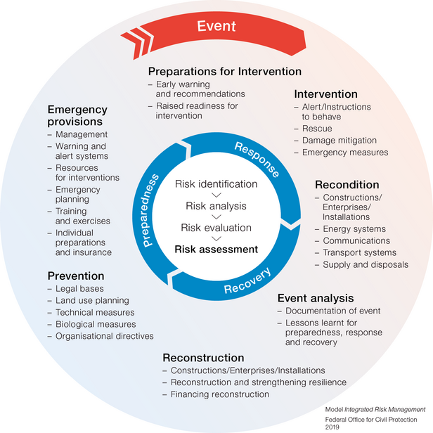Until the 1980s, natural hazards were addressed primarily by reacting to events and repairing damage in hazardous areas. Beginning in the 1990s, however, experts began to rethink this approach and developed the first tools for planning risk-oriented protection measures. In Switzerland, protection against natural hazards is now based on the "Risk Minimisation Concept" (risk concept) and the principles of "Integral Risk Management". Specifically, this means reducing risks to an acceptable level rather than attempting to prevent natural hazards by all available means. This risk concept has also been practiced in other sectors, such as the use of nuclear energy for civilian purposes, for some time.