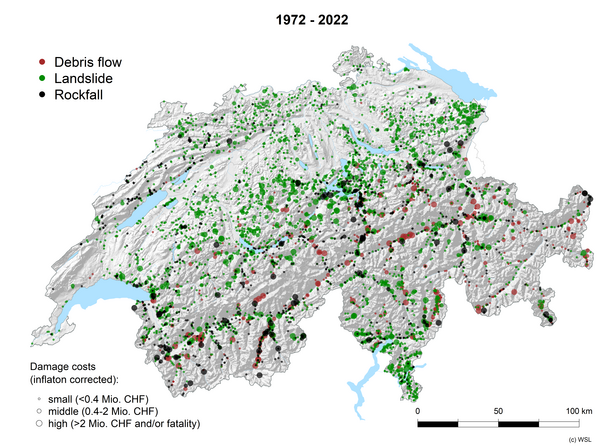 Debris flows destroy buildings, power lines and anything else that lies in their path. The fact that they often feature a high proportion of large boulders, combined with their speed, makes them among the top three events in Switzerland in terms of the amount of damage caused. They are particularly dangerous for humans as they occur with very little warning, often taking just minutes to reach a critical point.