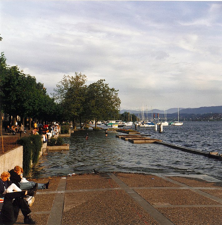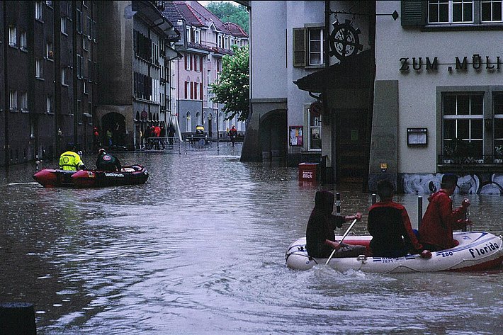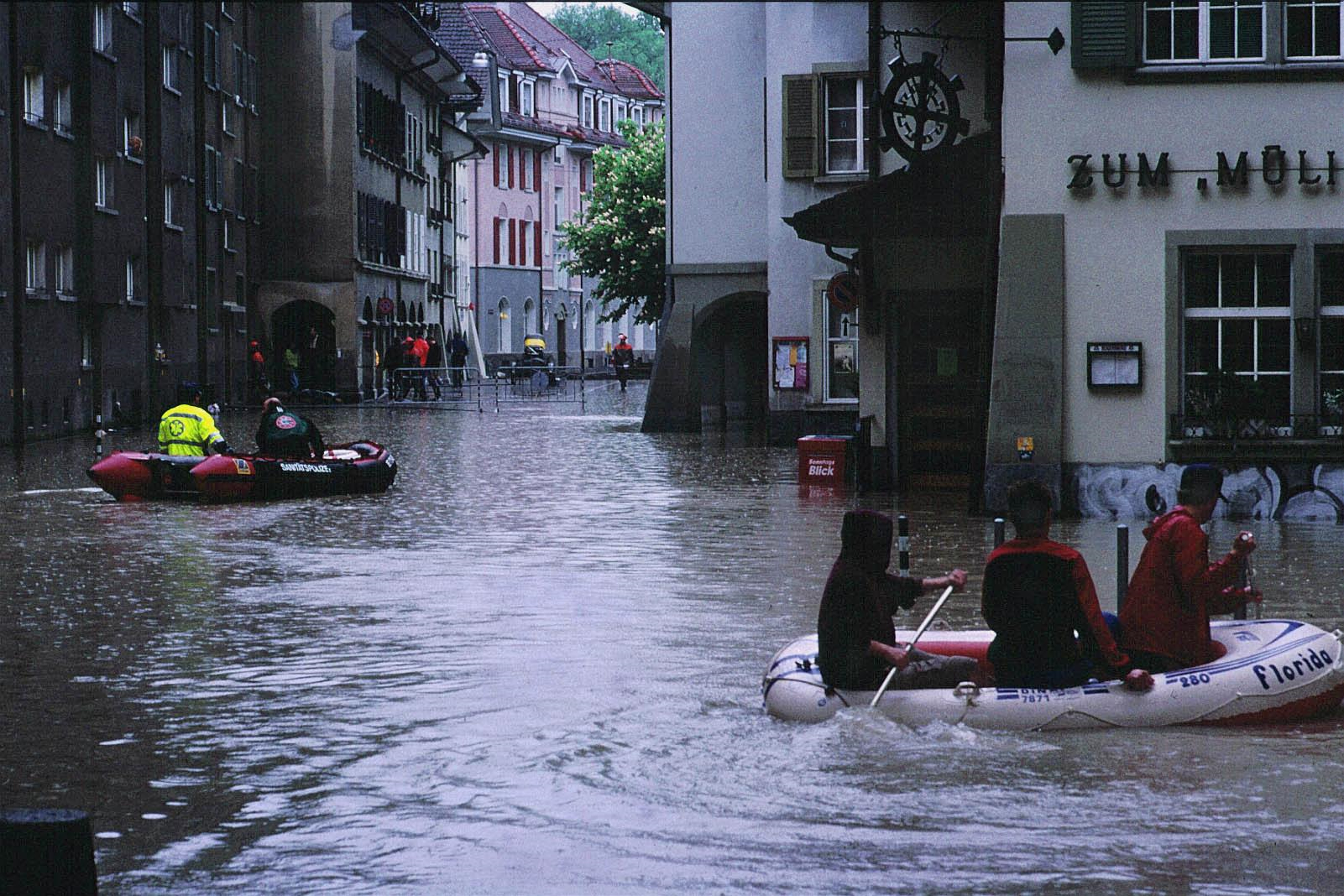 "In Thun, many people's homes were flooded on Ascension Day 1999," says Christoph Hegg, Acting Director of the WSL. "In the historic 'Matte' district of Berne, people were driving around in boats." At the peak of the Ascension Day flood, the left bank of Lake Thun was 400 metres further inland than usual, for several kilometres along the lake. Much of the canton of Zurich was under water. In Rheinfelden, the Rhine flooded the Zollvorplatz, shops, and cellars. In some villages on the shores of Lake Constance, houses close to the shore were under water for weeks.