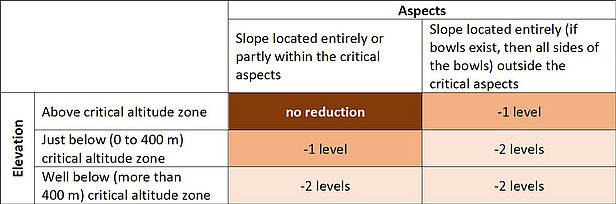 The task of assessing an individual slope cannot be automated. The statistical risk determined by the methods described above serves as a reference value in this context. Although far from perfect, it represents a good assumption. Using information acquired in the field, the reference value can be adjusted accordingly – either upwards or downwards. The more clear-cut the information, the more reliable the local assessment. As a rule, it is therefore advisable, unless contrary indications take precedence, to follow the recommendation of avoiding very steep slopes within the critical altitude zone and in the critical aspects when "considerable" avalanche danger is determined.