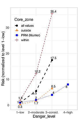 - Avalanche risk increases significantly (approximately fourfold) from one danger level to the next (see black curve in Fig. 1). Measured against the findings of the study, therefore, the ordinarily assumed doubling of the danger potential1 underestimates the extent of the increase.