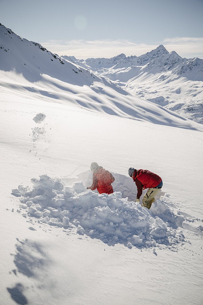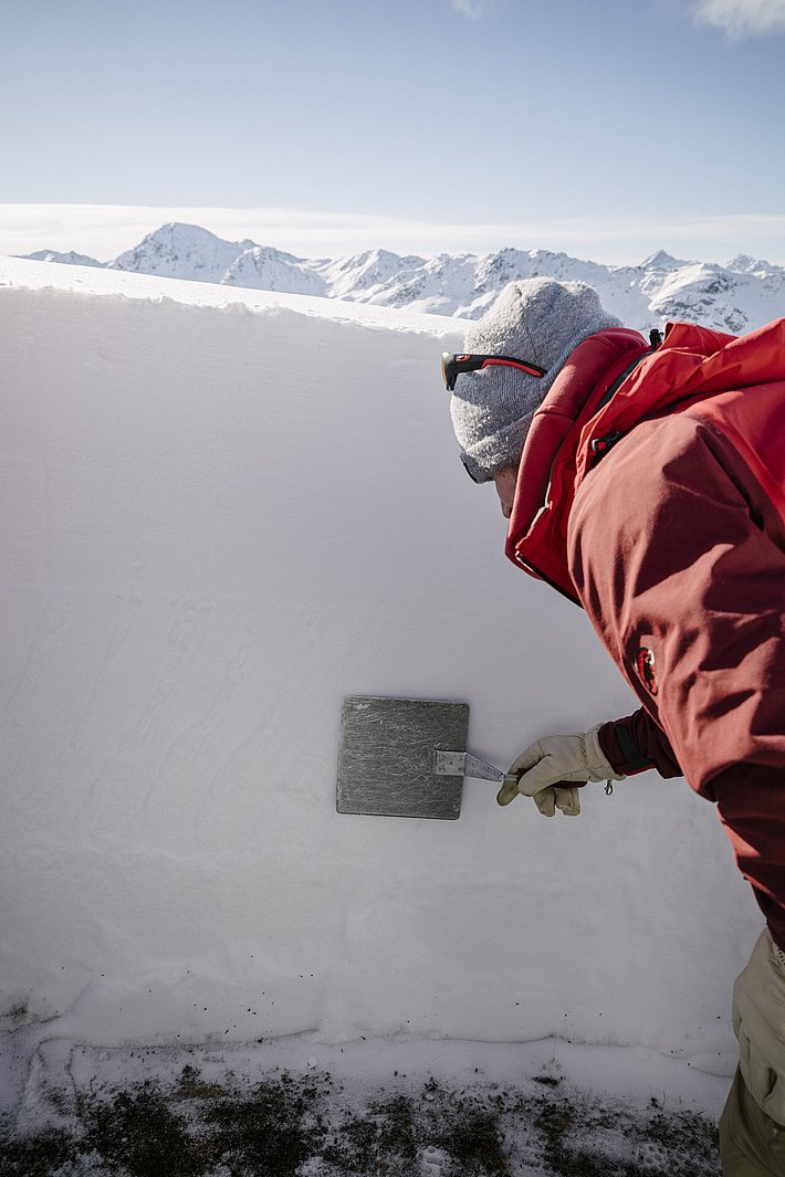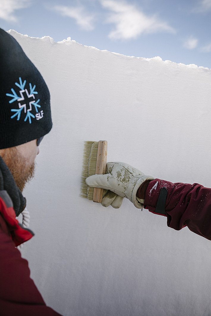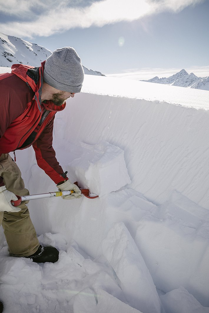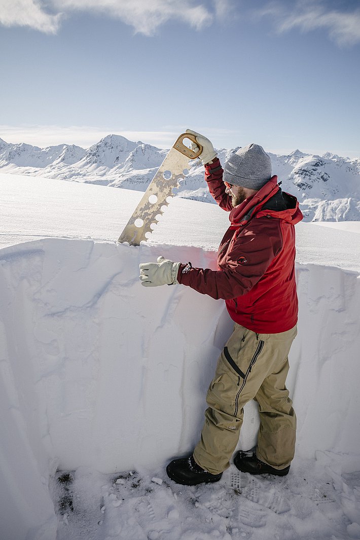 For their test, they need a straight snow wall, a snow profile free from bumps and dents. Walter starts by sawing,… (photo: Bruno Augsburger)
