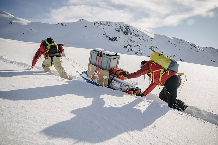 …then lug and push their equipment through the snow… (photo: Bruno Augsburger)
