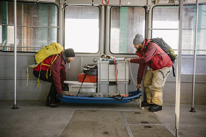 Physicists Benjamin Walter (right) and Lars Mewes carefully set down their apparatus in the Pischa cable car, which will transport them to an elevation of almost 2,500 metres. (Photo: Bruno Augsburger)