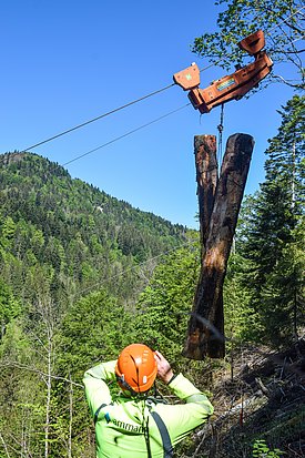 Forests must be maintained so that they can provide their valuable services in the long term and sustainably. For the necessary work, the forestry service uses heavy machinery such as tractors and forwarders. However, steep terrain is hardly accessible for these machines. And in the lowlands, care is taken to protect sensitive soils. In both cases, the cable cranes (also kown as cable yarders) is an alternative: A carriage moving on the skyline is used to transport logs to the collection point. Such logging methods are currently used on about a quarter of the Swiss forest area. To ensure that the cable road is guided safely and efficiently in each case, the people in charge must carefully plan the system to suit the terrain conditions. This way, the workers on site know where to pull the cable through and where to build intermediate supports.