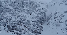 After walking on, we reached a basin where the landscape was dominated by rock walls and couloirs. And peopled by an enormous variety of climbers, skiers and hikers. I was astonished at the sheer size of the crowd! Until that moment I had not given any thought to avalanche risks, but I suddenly realised that a warning service was essential here. The key factor when assessing avalanche hazards is whether or not a release can be triggered by people. Avalanche size is far less relevant, since avalanches will almost invariably have serious consequences, irrespective of their size. The terrain here is either flat or extremely steep – very few slopes qualify as 'only' steep. It is very difficult to describe the conditions that prevail in Scotland with the tools provided by the European avalanche danger scale.