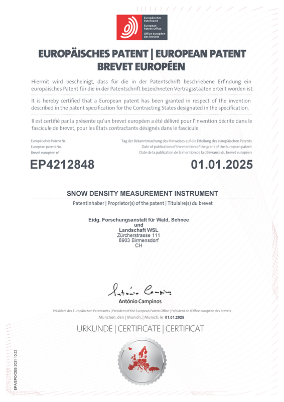 The SnowImager analyses the snowpack faster and more objectively than a human creating a traditional snow profile. This saves time in practice. The data helps to warn against natural hazards such as avalanches and floods. It also provides significant insights for climate research. After years of development, the device has now been patented through the European Patent Office.