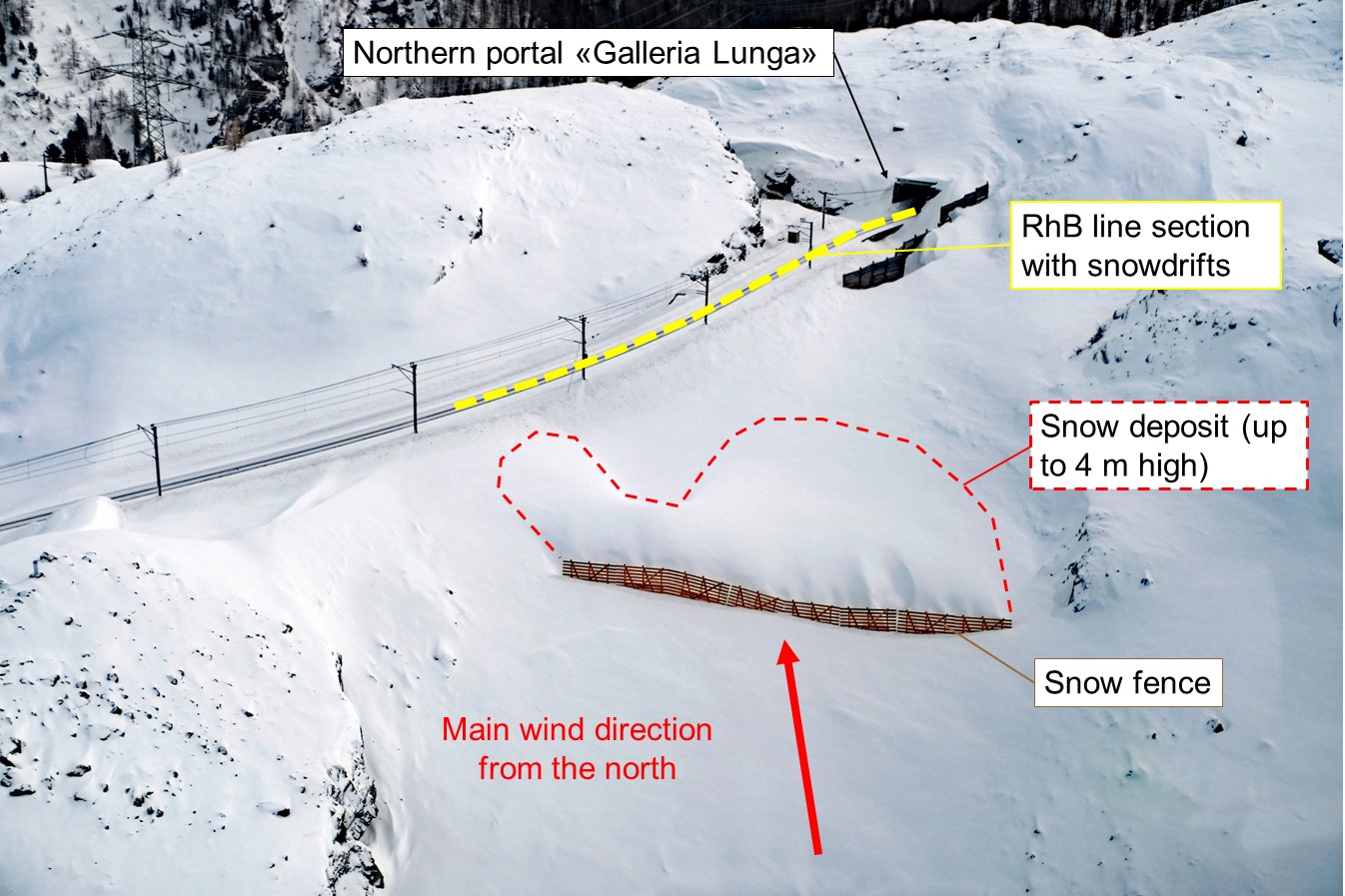 One of the problem areas is the northern entrance (known as a portal) to the Galleria Lunga tunnel, which is often blocked by snowdrifts. To rectify the situation, the decision was made to erect a 40-metre-long, four-metre-high wooden snow fence; this fence was installed in autumn 2020. Such fences slow down the wind, ensuring that snow is deposited specifically on the leeward side and consequently reducing the amount of snow blown onto the tracks.