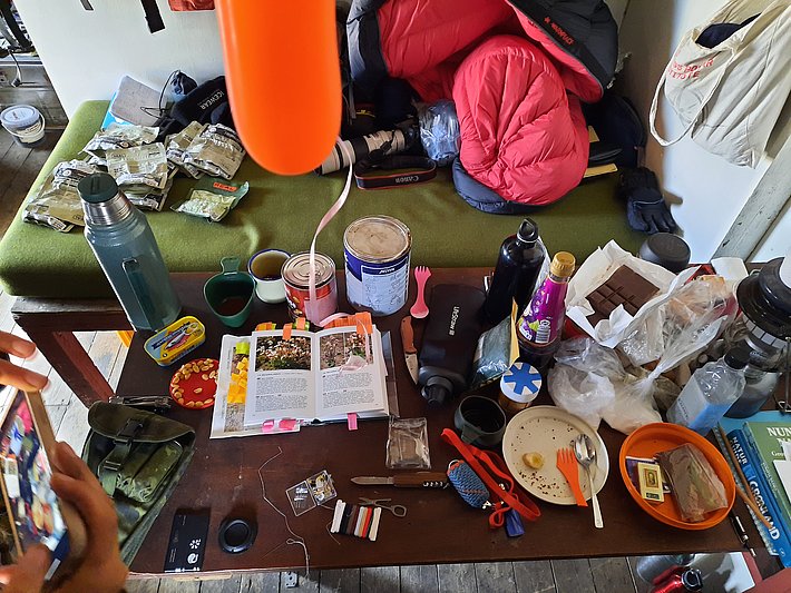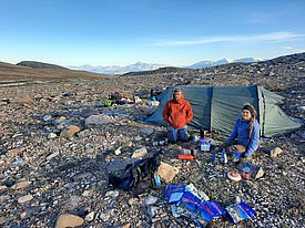 The weather's good and work progresses well. But how do we protect ourselves from polar bears that might decide to pay us a visit at night? First, we set up a polar bear alarm fence around the tent. It doesn't deter the bears, but it does emit a warning sound if a large animal (or a person) walks into the tripwire. The only trouble is that you then have to be out of your sleeping bag and tent in a couple of seconds in order to take action. That isn't safe enough for us, so we decide to keep watch overnight. We each take a turn in three-hour shifts, e.g. from midnight to 3 a.m., from 3 to 6 a.m. and from 6 to 9 a.m. That way, everyone gets around six hours' sleep. Not enough, but it'll have to do. The sun shines 24 hours a day anyway, and the view from the camp makes up for the lack of sleep. The middle shift isn't the most popular, but is sometimes rewarded with sightings of mountain hares, which are almost completely white even in summer. They don't seem bothered by our presence. Musk oxen also approach the camp, but disappear again pretty quickly. The polar bear count is zero (fortunately!).