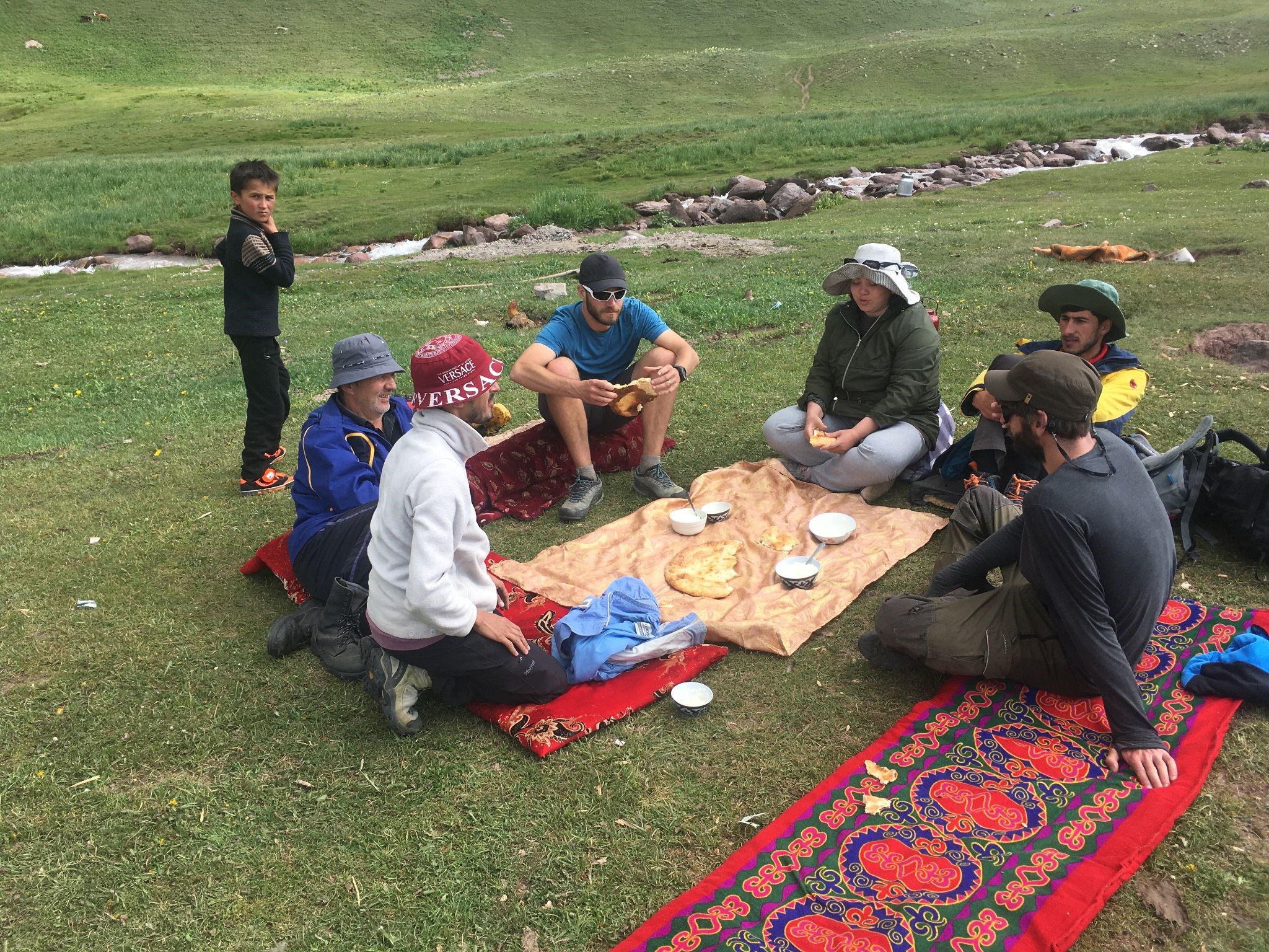 Not far from the base camp, shepherds and their families live in tents, yurts or mud-houses. We were lucky to experience the astounding hospitality of these people, inviting us to their place for some home-made yogurt, fresh cream, butter and bread. Lunches during the campaign consisted mostly of local breads (“nohn”), with smoked cheese, sausages, and nuts, while dinners often included mutton in vegetable soups (“shurbo”) or in fried rice with carrots (“osh”). Meat is an important part of most meals in Tajikistan, so being a vegetarian can be quite challenging. We initially prevented ourselves from eating raw vegetables, such as the tempting tomatoes and cucumbers served to us daily, but some of our team lifted this restriction as they succumbed to stomach problems despite best efforts.