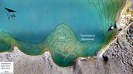 Nevertheless, for thermal reasons, permafrost cannot exist in a mountain lake. This therefore implies that the lake is more recent than the lobe at its base. This explains the presence of the marked depression in the lobe, close to the lake shore. The rising lake water melted the ice in the lobe, its surface collapsed and a so-called thermokarst depression was formed.