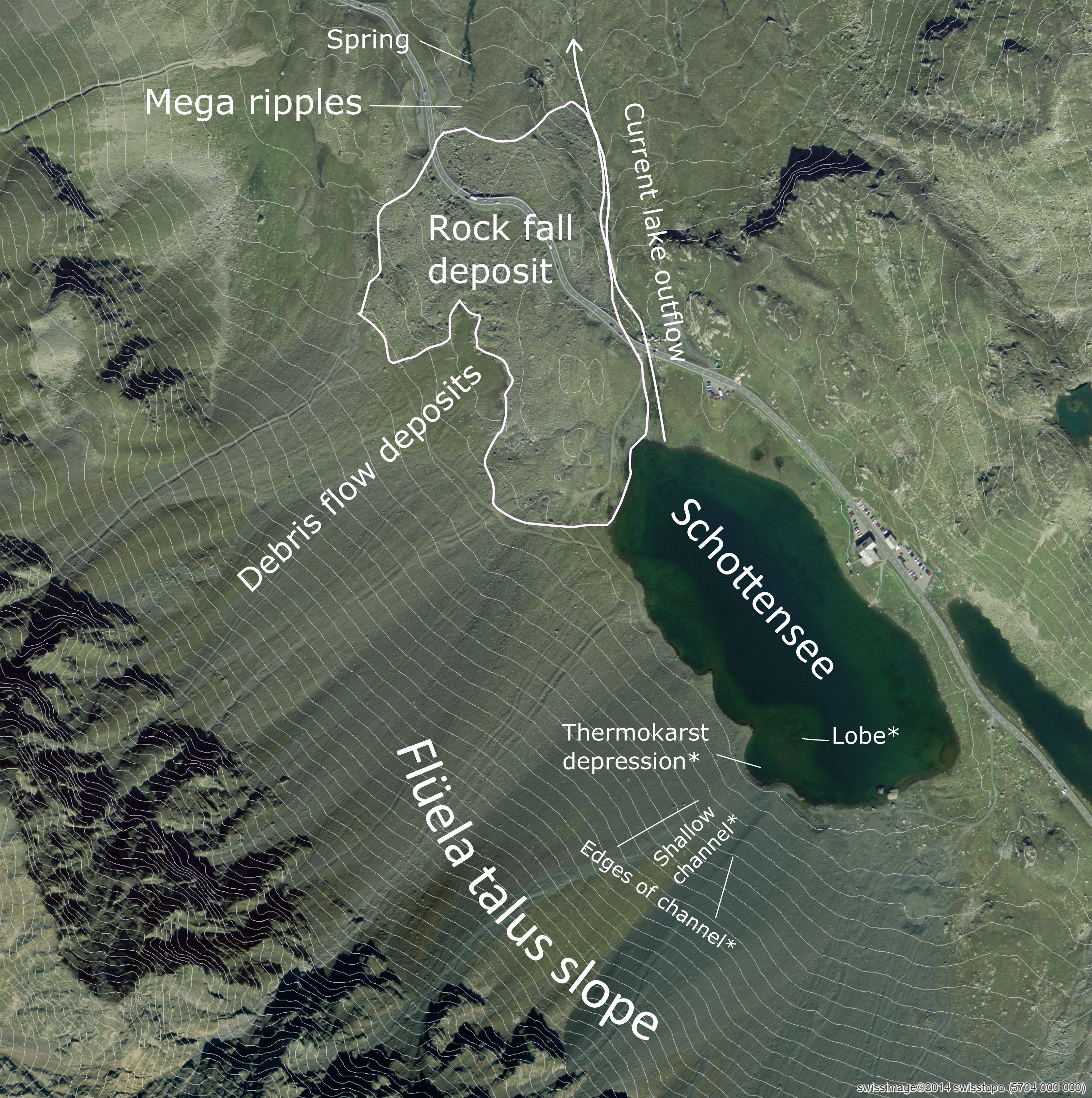 Swiss mountain permafrost research started in the 1970s in the talus slope above and SW of lake Schottensee at Flüelapass. Interesting information on the dynamics of mountain permafrost can still be obtained from this site today.