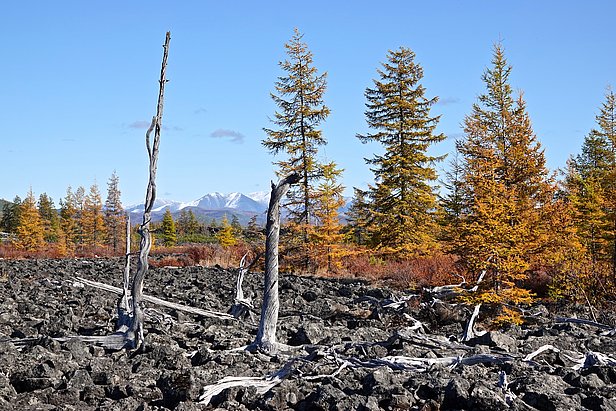 In late August and early September 2019, we undertook the first interdisciplinary and international pilot mission to Anyui volcano, where we sampled living and dead larch trees (Fig. 3; Larix cajanderi Mayr) using increment corers and chain saws. During our pilot expedition, we used helicopter support (based out of the settlement of Kiperveem about 60 km distant) to reach the volcano and to relocate between temporary field camps on the lava flow field along a roughly 1000 m elevation gradient (Fig. 4).