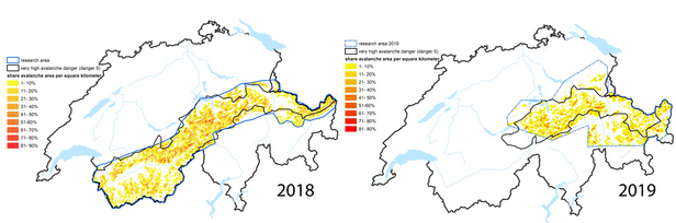 In both, January 2018 and 2019, periods with very high avalanche danger (level 5) occurred over large parts of Switzerland for the first time since 1999. We carried out a comprehensive documentation of those events (Bühler et al., 2019) in cooperation with the BAFU, the cantons Valais and Grisons as well as swisstopo, relying on optical satellite imagery (SPOT 6, 1.5m resolution). During the large-scale mapping over the vast area of ~22’000 km2 (2018: ~12’500 km2; 2019: ~9’500 km2) a total of 24 778 (2018: 18 737; 2019: 6 041) single avalanche polygons were manually mapped (Fig. 1). Additionally, weather independent radar data (TerraSAR-x & Sentinel-1) were tested in some overlapping areas (Leinss et al., 2020).