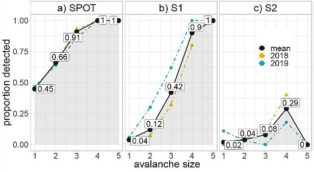 To investigate the reliability of the mapped avalanches an evaluation of performance and completeness for both years was conducted in a test area of 180 km2 around Davos, Switzerland. With an overall Probability of Detection (POD) of 0.74 and a Positive Predictive Value (PPV) of 0.88 for avalanches larger than size 1, SPOT reliably mapped the majority of avalanches. For the same area Sentinel-1 (radar) mapped the avalanches with a POD of 0.27 and a PPV of 0.87 (avalanches ≥ size 2). These differences stem from differing detection rates per avalanche size shown in Figure 3. Both methods show declining ability to comprehensively map avalanches with decreasing size, for Sentinel-1 this decline is however more pronounced. With a PPV of 0.81 the mapping from Sentinel-2 (optical, less resolution than SPOT) would be reliable but the POD of 0.06 shows that very few avalanches are mapped altogether.