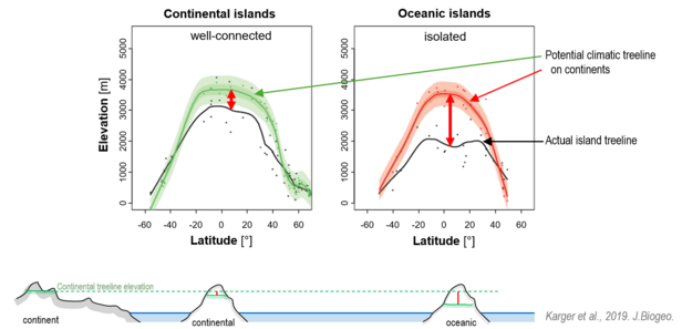 Therefore, we here formulate the “biome size – stress resistance” theory, which predicts that more biodiverse biome patches exhibit a higher tolerance of the biome-dominant species to abiotic (e.g., for cold or drought) or biotic (e.g., biological invasions) stress. Practically, this means that if a biome has a small area on continent “A”, it is less tolerant to abiotic or biotic stress tolerance than if the same biome has a large area on continent “B”. Plausible examples are the high rates of biological invasions (biotic stress) on small and/or long disconnected islands (Hawai’i, New Zealand) or continents (Australia) or the tree line temperature on continental (well-connected) vs. oceanic (disconnected) islands (Fig. 2). And the term area stands for the integral of area and connectedness, now and through the last 5-10(-20) million years relevant to evolve the contemporary plant biodiversity- To test this theory, we formulate several analyses steps.