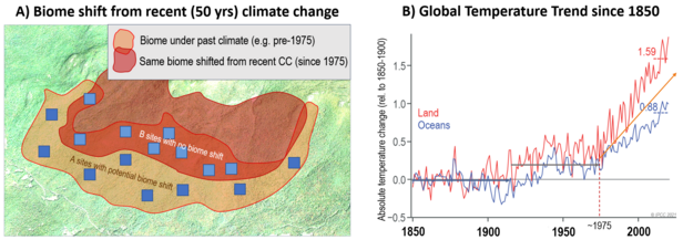 Over the past 40 years, we have seen a dramatic rate of rapidly increasing global temperatures and associated regional changes in precipitation patterns. While these changes have shifted the potential geographical boundaries of all major biomes of the globe, the actual shifts of biomes lag severely. This is due to the fact that shifting thousands of plants, animals, fungi and microbes takes decades, centuries and millennia. We therefore have many regions of individual biome patches that are no longer in sync with their climate (Fig. 3). This can lead to severe abiotic (drought, fire, windthrow) or biotic (pest outbreaks, biological invasions) disturbances. We can further expect that most biomes have evolved strategies to cope with disturbances, as this is part of the adaptation to the prevailing environmental conditions. However, if recent climate change has brought a part of the past biome area to an untypical biome-climate due to rapidly changing climate since 1975, we can expect that the part of the biome that is no longer exposed to the proper biome climate is experiencing more severe and more frequent disturbances than in the past. The same is true for how biome-typical species respond to shifting climate. Yet, a potential biome shift most often translates to a different set of plant functional traits of the biome-dominant species to be optimally adapted. Biome shifts therefore represent a more massive maladaptation than if climate change suggests a shift from one species to another with both species having the same functional properties.