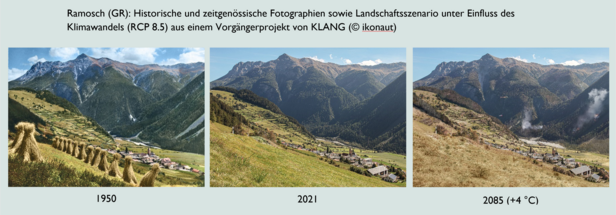 Climate change will have a major impact on Switzerland's landscapes. Numerous impacts of climate change come together and shape landscapes in interaction. Landscape is an important resource, provides numerous services for human well-being and is closely linked to a high quality of life. Many landscape services are threatened by climate change and its impacts. The project KLANG aims to contribute to a deeper understanding of the impacts of climate change on cultural landscapes. A holistic understanding of these impacts is crucial in order to grasp the ecological and social consequences of climate change. On this basis, sustainable adaptation strategies can be developed and landscapes can be preserved with their qualities and valuable services.