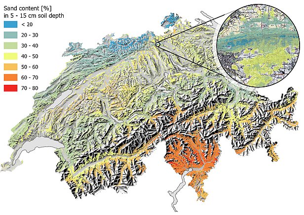 The aim of the project is to produce high-resolution soil maps for the Swiss forest. The soil maps, which are based on about 2000 soil profiles, contain chemical and physical properties such as pH, texture or carbon content for various soil depths. The soil depth itself is also modelled.