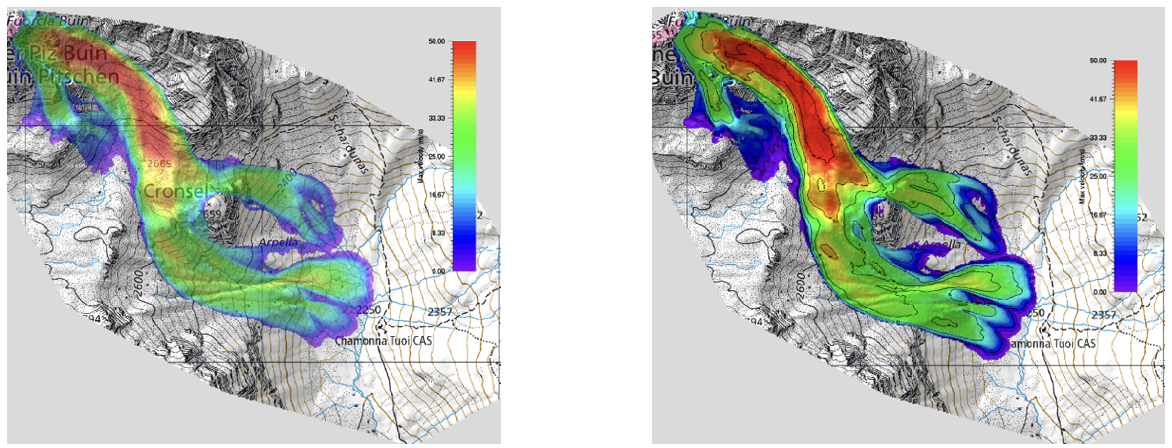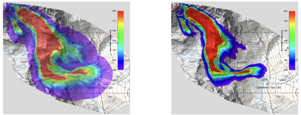 After evaluation of the DEMs, orthophotos, and structural setting of the rock mass, geologic modeling was performed to provide estimates of the possible release volume in case of slope failure. Simulations with these volumes were performed using RAMMS (Rapid Mass Movement Simulation), to gain first insights on the hazard potential. The calculations were carried out using the newly developed rock/ice module, allowing for the simulation of mixed flow forms (rock/ice/snow), thus estimating the influence during the event of any free water that may be present. Different failure scenarios were computed, such as mass release in winter conditions, i.e., with the presence and entrainment of snow, or in the summer season, i.e., with saturated or dry conditions of the entrainment zone. Moreover, the powder cloud and associated pressures generated by the modeled slope failures have been computed in all cases. If the rock avalanche is able to overflow the terrace at Cronsel, there is considerable danger from the dust cloud. Computed pressures of the dust in the vicinity of the hut is up to 3kPa. Similar pressures were caused in the past injuries to people in high mountain regions. Moreover, it must be assumed that the dust cloud carries smaller stones at high speed and could damage the hut and potentially also kill people.
