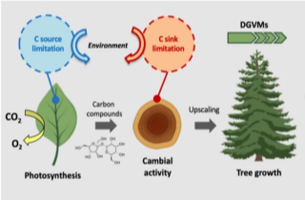 What are the drivers of tree growth? Current vegetation models often implicitly assume that tree growth is limited by photosynthesis (the tree carbon source). Recent evidence however suggests that biophysical limitations to cambial cell expansion and division (carbon sink), e.g., cell turgor pressure, can strongly constrain tree growth, even under ample carbon supply, with large implications for carbon cycle modelling. MiCSS aims to study how carbon source and sink limitations to tree growth might interact. To do so the project will leverage a range of data, from cellular-level observations of wood formation to stand-level estimates of photosynthesis and translate acquired insights into a new model of tree growth.